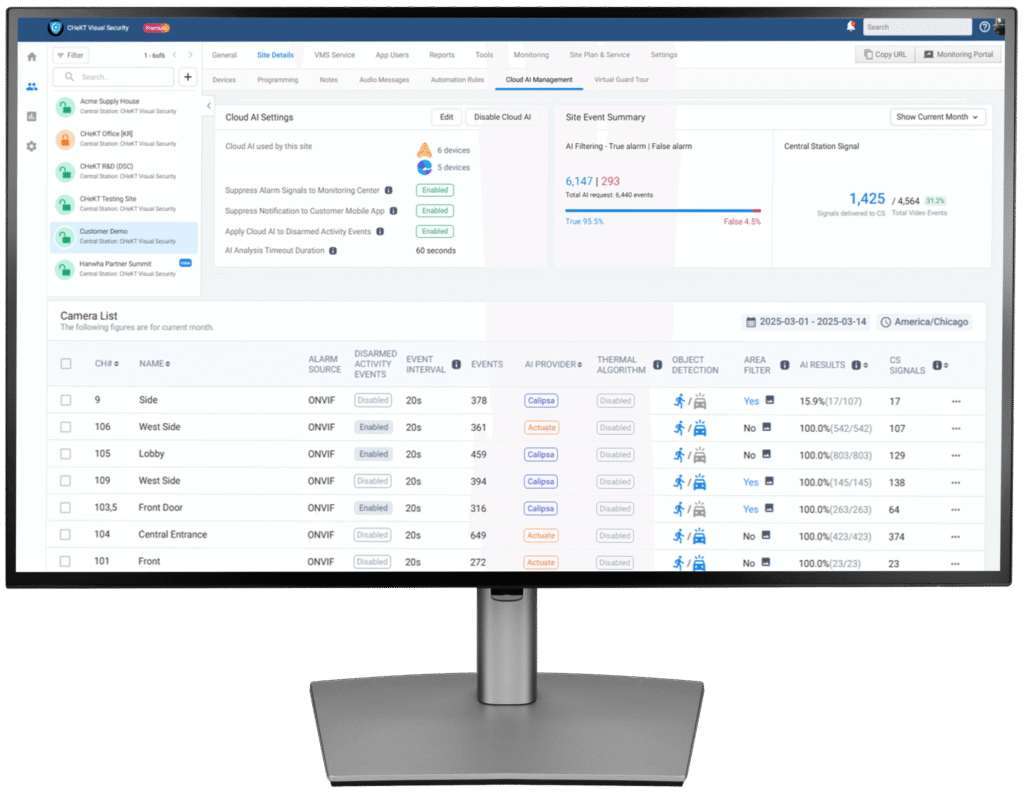 The CHeKT Dealer Portal allows for remote device configuration, including designating alarm zones and AI filtering.